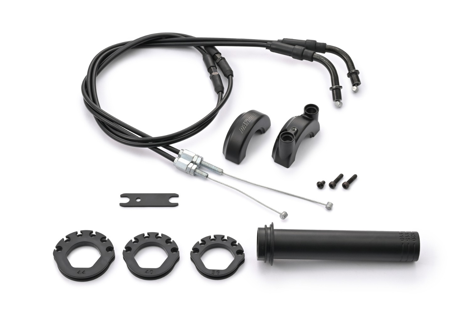 - For 7/8" (22.2mm) handlebar. - Cast aluminum housing- Inner tube 125mm, cut lines at 110/115/120mm- 3 size reels, dia. 36/40/44mm- 900mm throttle cable set, pull & reverse
